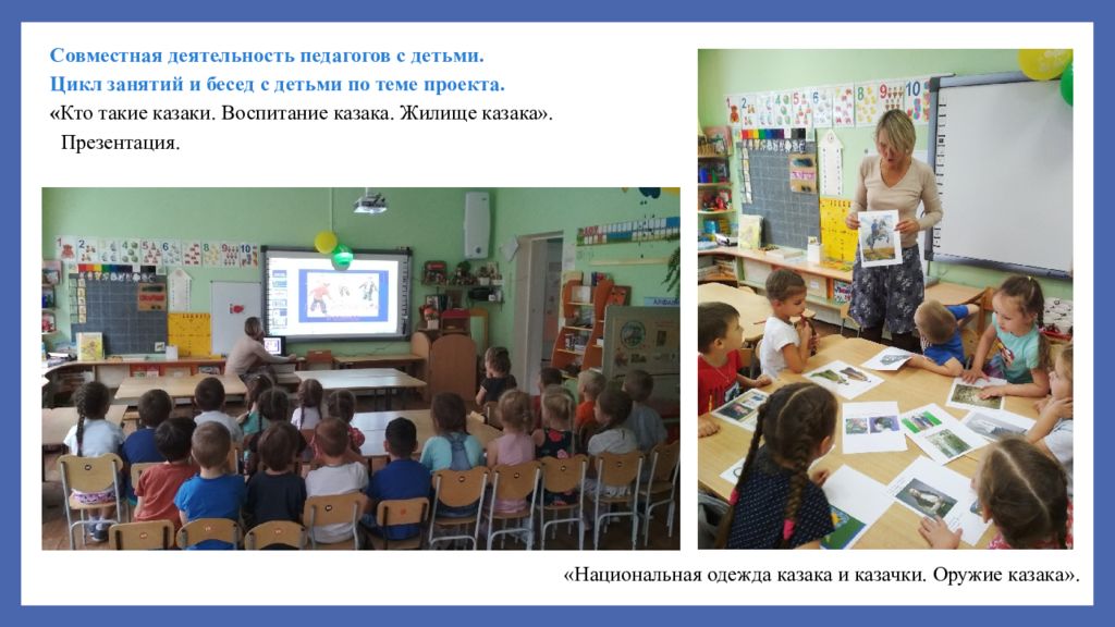 Совместная деятельность педагогов с детьми. Цикл занятий и бесед с детьми по теме проекта. « Кто такие казаки. Воспитание казака. Жилище казака». Презентация. «Национальная одежда казака и казачки. Оружие казака».