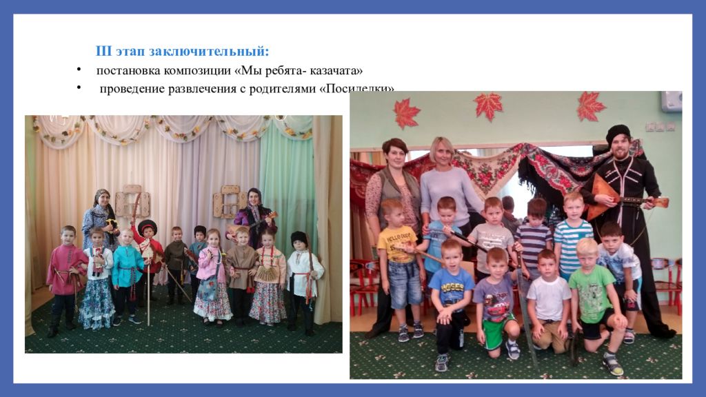 III этап заключительный: постановка композиции «Мы ребята- казачата» проведение развлечения с родителями «Посиделки»
