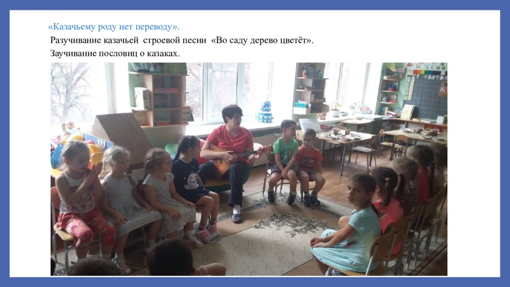 «Казачьему роду нет переводу». Разучивание казачьей строевой песни «Во саду дерево цветёт». Заучивание пословиц о казаках.