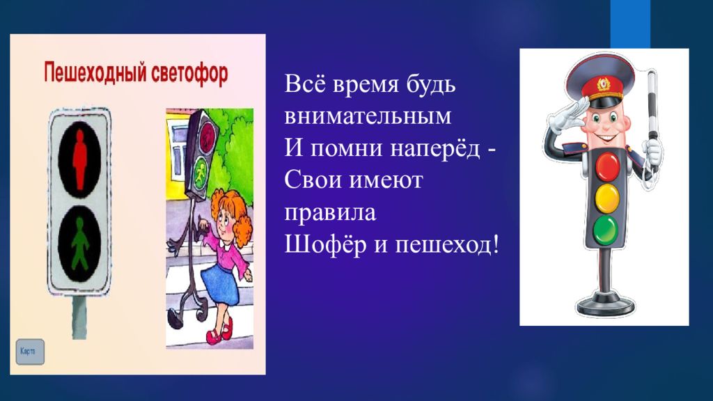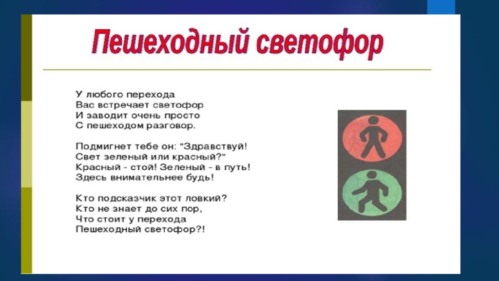 Есть на каждом перекрестке Пешеходный переход Перейти дорогу просто Здесь без риска и хлопот!