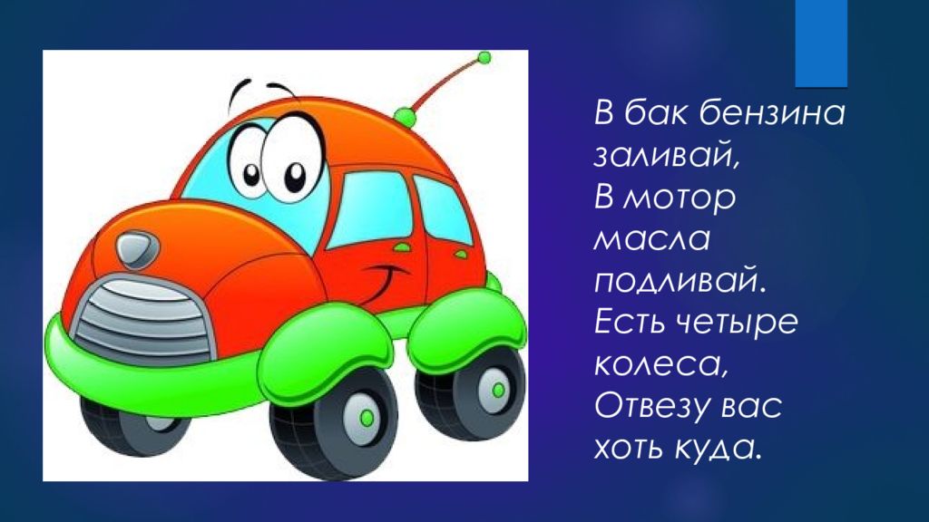 В бак бензина заливай, В мотор масла подливай. Есть четыре колеса, Отвезу вас хоть куда.