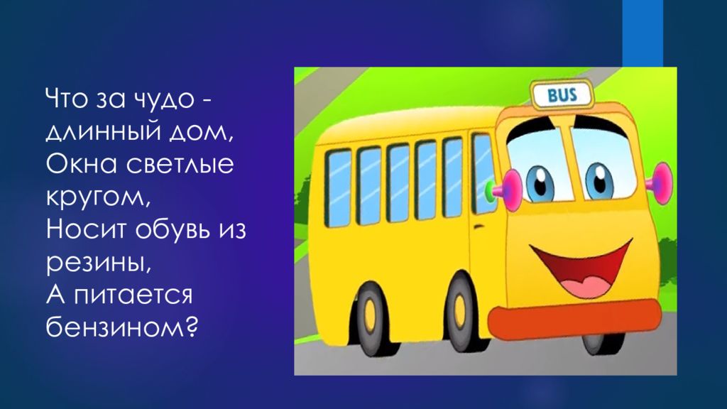 Что за чудо - длинный дом, Окна светлые кругом, Носит обувь из резины, А питается бензином?