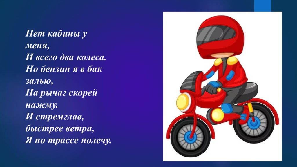 Нет кабины у меня, И всего два колеса. Но бензин я в бак залью, На рычаг скорей нажму. И стремглав, быстрее ветра, Я по трассе полечу.