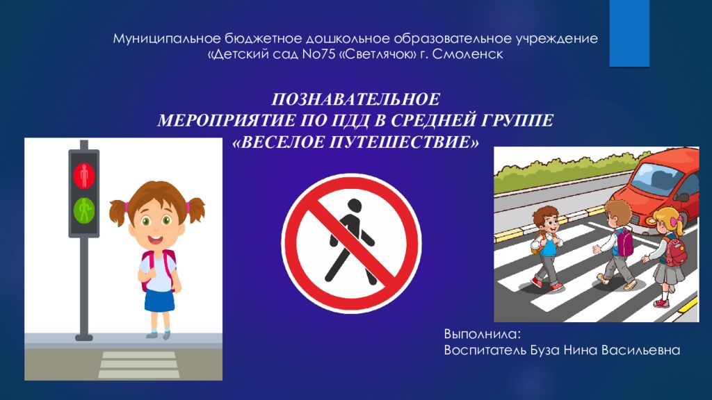 Муниципальное бюджетное дошкольное образовательное учреждение «Детский сад No75 «Светлячок» г. Смоленск ПОЗНАВАТЕЛЬНОЕ МЕРОПРИЯТИЕ ПО ПДД В СРЕДНЕЙ ГРУППЕ «ВЕСЕЛОЕ ПУТЕШЕСТВИЕ» Выполнила: Воспитатель Буза Нина Васильевна