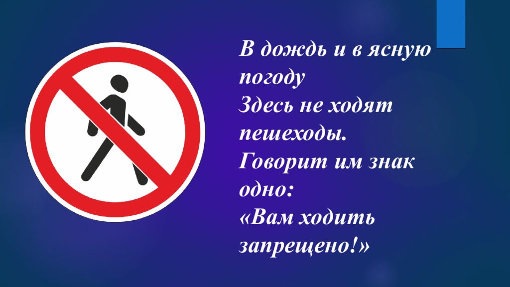 В дождь и в ясную погоду Здесь не ходят пешеходы. Говорит им знак одно: «Вам ходить запрещено!»