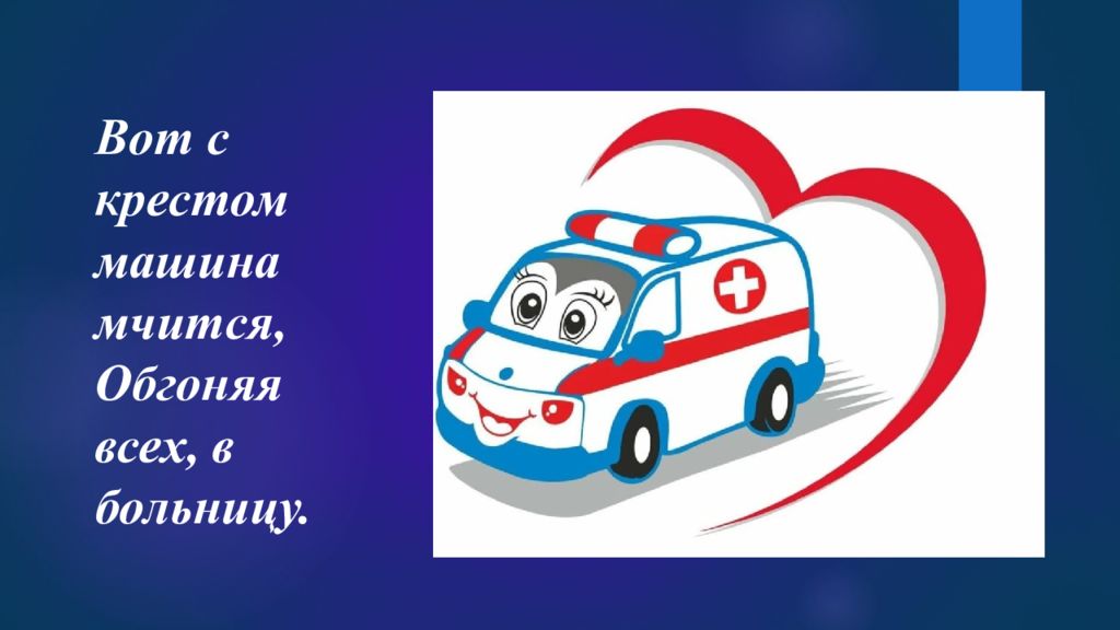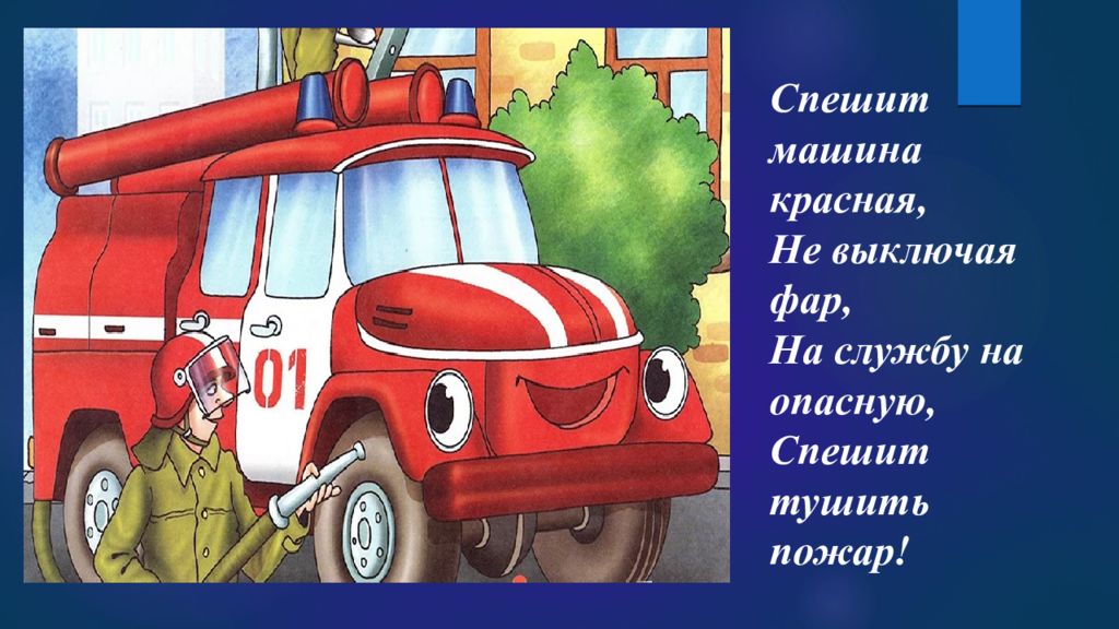 Спешит машина красная, Не выключая фар, На службу на опасную, Спешит тушить пожар!