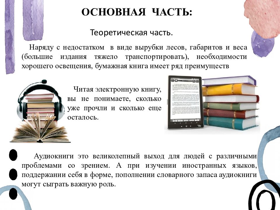 ОСНОВНАЯ ЧАСТЬ: Теоретическая часть. Наряду с недостатком в виде вырубки лесов, габаритов и веса (большие издания тяжело транспортировать), необходимости хорошего освещения, бумажная книга имеет ряд преимуществ Читая электронную книгу, вы не понимаете, сколько уже прочли и сколько еще осталось. Аудиокниги это великолепный выход для людей с различными проблемами со зрением. А при изучении иностранных языков, поддержании себя в форме, пополнении словарного запаса аудиокниги могут сыграть важную роль.