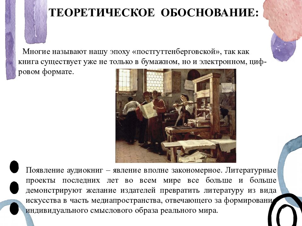ТЕОРЕТИЧЕСКОЕ ОБОСНОВАНИЕ: Многие называют нашу эпоху « постгуттенберговской », так как книга существует уже не только в бумажном, но и электронном, циф - ровом формате. Появление аудиокниг – явление вполне закономерное. Литературные проекты последних лет во всем мире все больше и больше демонстрируют желание издателей превратить литературу из вида искусства в часть медиапространства, отвечающего за формирование индивидуального смыслового образа реального мира.