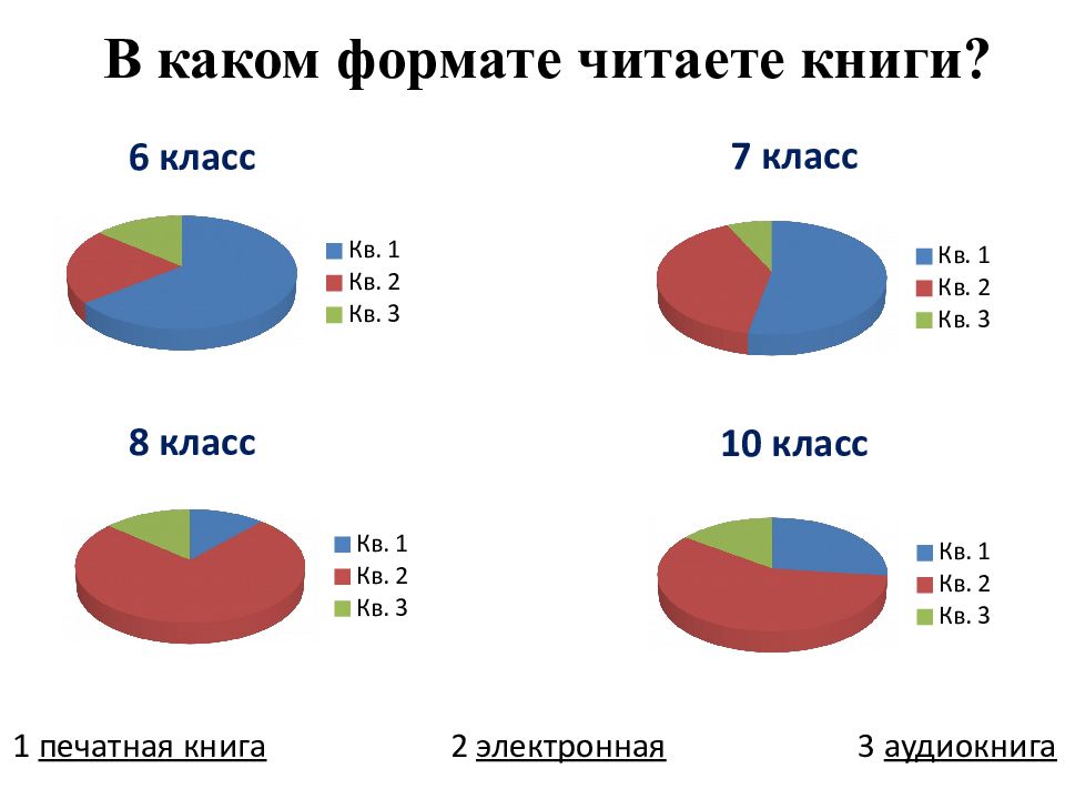 В каком формате читаете книги? 6 класс 7 класс 8 класс 10 класс 1 печатная книга 2 электронная 3 аудиокнига