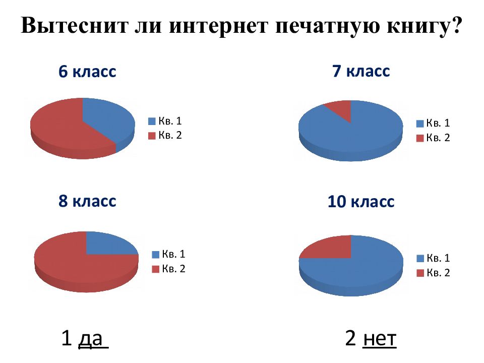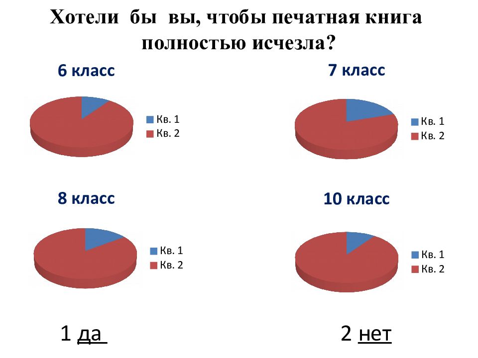 Хотели бы вы, чтобы печатная книга полностью исчезла? 6 класс 7 класс 8 класс 10 класс 1 да 2 нет