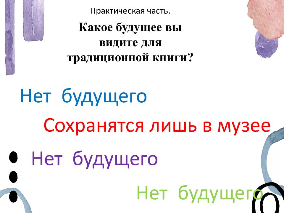 Практическая часть. Какое будущее вы видите для традиционной книги? Нет будущего Сохранятся лишь в музее Нет будущего Нет будущего