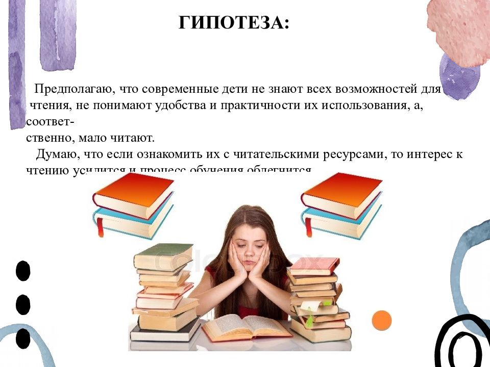 ГИПОТЕЗА: Предполагаю, что современные дети не знают всех возможностей для чтения, не понимают удобства и практичности их использования, а, соответ - ственно, мало читают. Думаю, что если ознакомить их с читательскими ресурсами, то интерес к чтению усилится и процесс обучения облегчится.