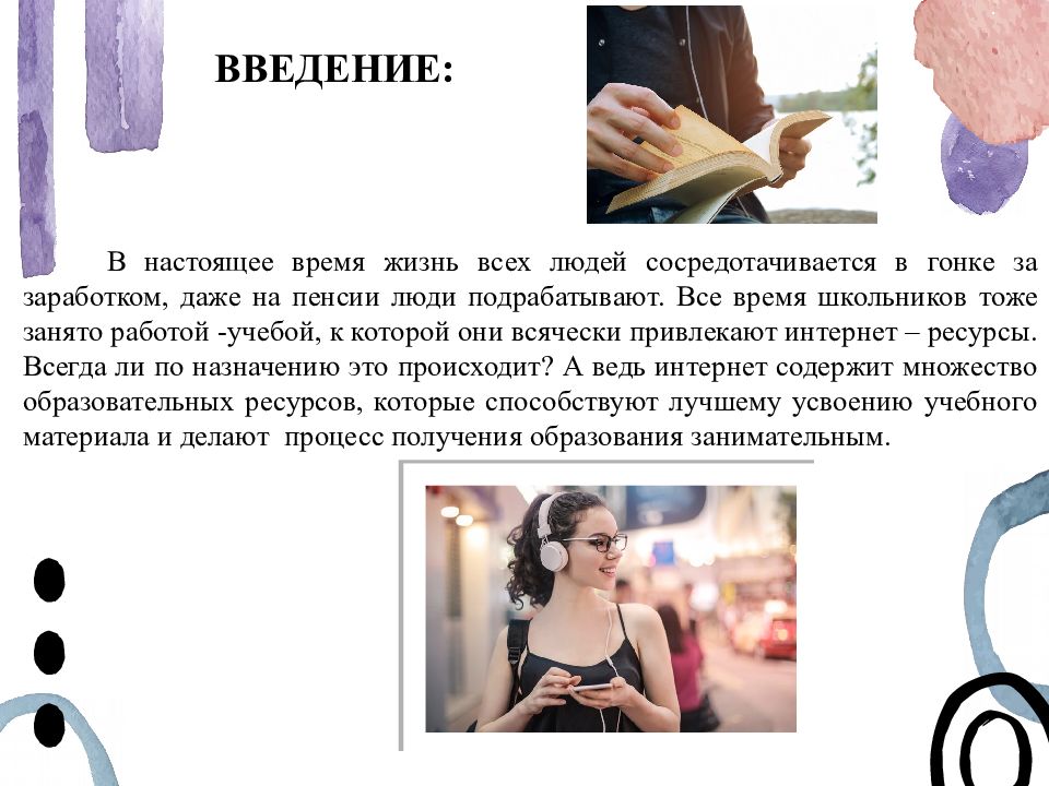 ВВЕДЕНИЕ: В настоящее время жизнь всех людей сосредотачивается в гонке за заработком, даже на пенсии люди подрабатывают. Все время школьников тоже занято работой -учебой, к которой они всячески привлекают интернет – ресурсы. Всегда ли по назначению это происходит? А ведь интернет содержит множество образовательных ресурсов, которые способствуют лучшему усвоению учебного материала и делают процесс получения образования занимательным.