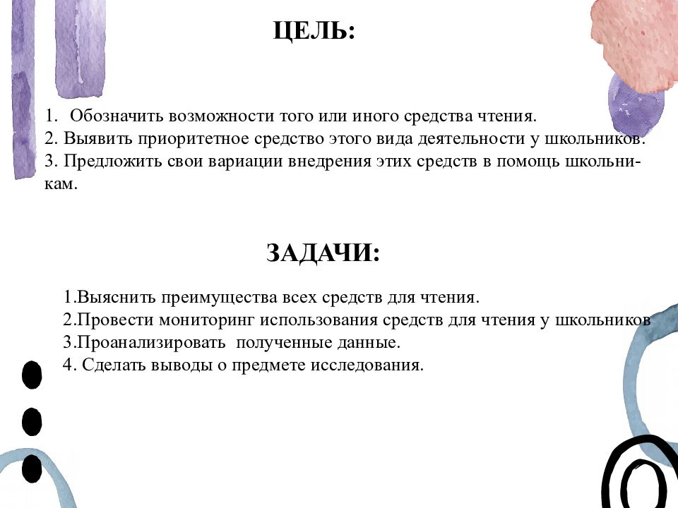 ЦЕЛЬ: Обозначить возможности того или иного средства чтения. 2. Выявить приоритетное средство этого вида деятельности у школьников. 3. Предложить свои вариации внедрения этих средств в помощь школьни - кам. ЗАДАЧИ: 1.Выяснить преимущества всех средств для чтения. 2.Провести мониторинг использования средств для чтения у школьников 3.Проанализировать полученные данные. 4. Сделать выводы о предмете исследования.