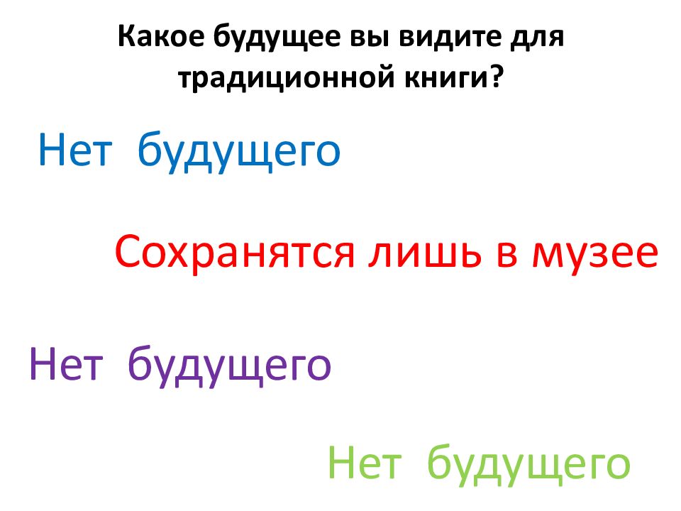 Какое будущее вы видите для традиционной книги? Нет будущего Сохранятся лишь в музее Нет будущего Нет будущего