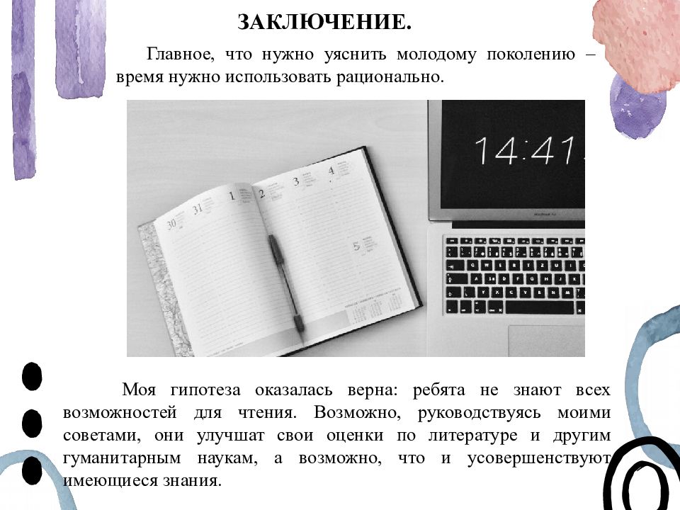 ЗАКЛЮЧЕНИЕ. Моя гипотеза оказалась верна: ребята не знают всех возможностей для чтения. Возможно, руководствуясь моими советами, они улучшат свои оценки по литературе и другим гуманитарным наукам, а возможно, что и усовершенствуют имеющиеся знания. Главное, что нужно уяснить молодому поколению – время нужно использовать рационально.
