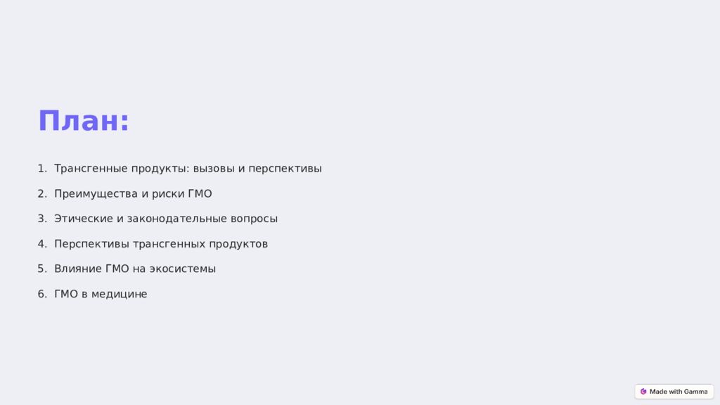 План: Трансгенные продукты: вызовы и перспективы Преимущества и риски ГМО Этические и законодательные вопросы Перспективы трансгенных продуктов Влияние ГМО на экосистемы ГМО в медицине