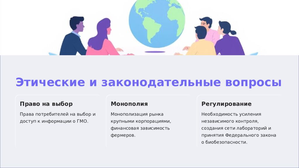 Этические и законодательные вопросы Право на выбор Права потребителей на выбор и доступ к информации о ГМО. Монополия Монополизация рынка крупными корпорациями, финансовая зависимость фермеров. Регулирование Необходимость усиления независимого контроля, создания сети лабораторий и принятия Федерального закона о биобезопасности.