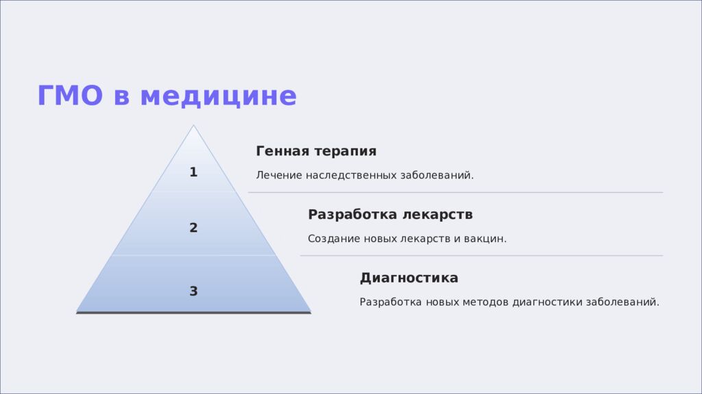 ГМО в медицине Генная терапия Лечение наследственных заболеваний. Разработка лекарств Создание новых лекарств и вакцин. 3 Диагностика Разработка новых методов диагностики заболеваний. 2 1