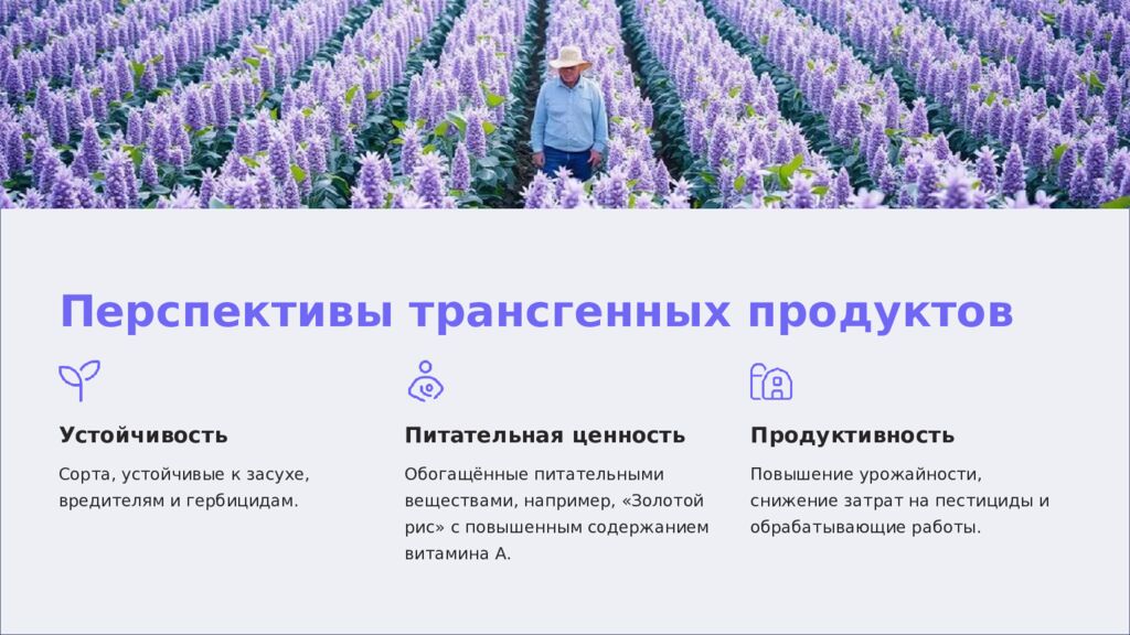 Перспективы трансгенных продуктов Устойчивость Сорта, устойчивые к засухе, вредителям и гербицидам. Питательная ценность Обогащённые питательными веществами, например, «Золотой рис» с повышенным содержанием витамина А. Продуктивность Повышение урожайности, снижение затрат на пестициды и обрабатывающие работы.