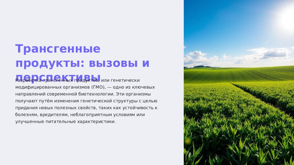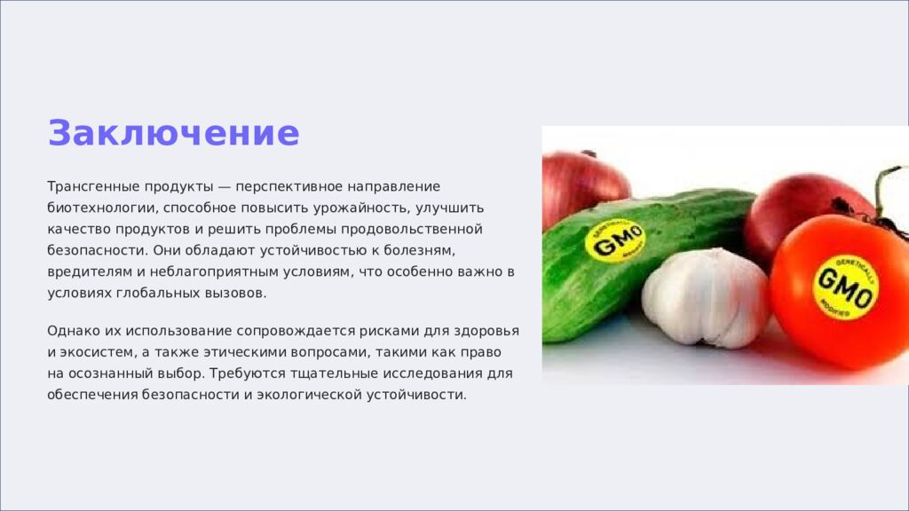 Заключение Трансгенные продукты — перспективное направление биотехнологии, способное повысить урожайность, улучшить качество продуктов и решить проблемы продовольственной безопасности. Они обладают устойчивостью к болезням, вредителям и неблагоприятным условиям, что особенно важно в условиях глобальных вызовов. Однако их использование сопровождается рисками для здоровья и экосистем, а также этическими вопросами, такими как право на осознанный выбор. Требуются тщательные исследования для обеспечения безопасности и экологической устойчивости.