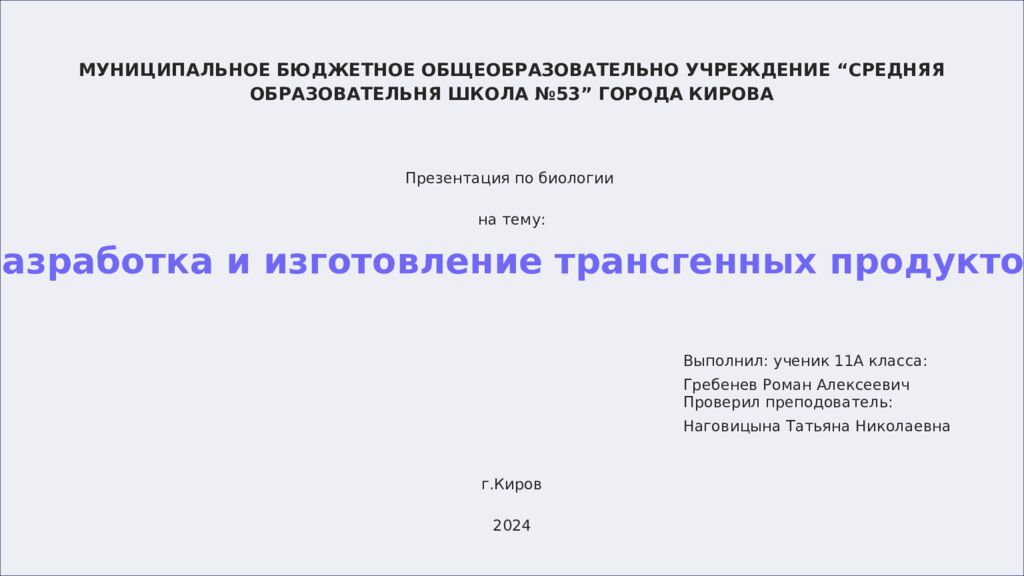 МУНИЦИПАЛЬНОЕ БЮДЖЕТНОЕ ОБЩЕОБРАЗОВАТЕЛЬНО УЧРЕЖДЕНИЕ “СРЕДНЯЯ ОБРАЗОВАТЕЛЬНЯ ШКОЛА №53” ГОРОДА КИРОВА Презентация по биологии на тему: “Разработка и изготовление трансгенных продуктов” Выполнил: ученик 11А класса : Гребенев Роман Алексеевич Проверил преподователь : Наговицына Татьяна Николаевна г.Киров 2024