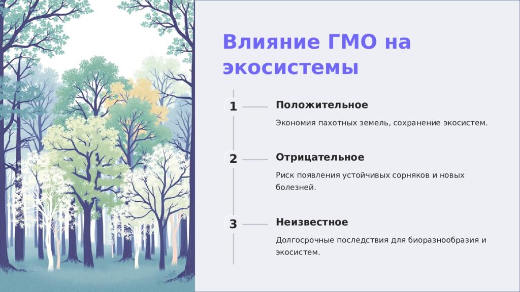 Влияние ГМО на экосистемы 1 Положительное Экономия пахотных земель, сохранение экосистем. 2 Отрицательное Риск появления устойчивых сорняков и новых болезней. 3 Неизвестное Долгосрочные последствия для биоразнообразия и экосистем.
