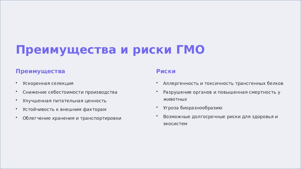 Преимущества и риски ГМО Преимущества Ускоренная селекция Снижение себестоимости производства Улучшенная питательная ценность Устойчивость к внешним факторам Облегчение хранения и транспортировки Риски Аллергенность и токсичность трансгенных белков Разрушение органов и повышенная смертность у животных Угроза биоразнообразию Возможные долгосрочные риски для здоровья и экосистем