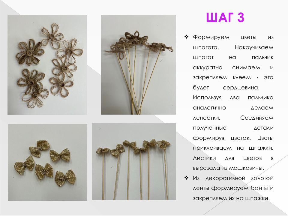 ШАГ 3 Формируем цветы из шпагата. Накручиваем шпагат на пальчик аккуратно снимаем и закрепляем клеем - это будет сердцевина. Используя два пальчика аналогично делаем лепестки. С оединяем полученные детали формируя цветок. Цветы приклеиваем на шпажки. Листики для цветов я вырезала из мешковины. Из декоративной золотой ленты формируем банты и закрепляем их на шпажки.