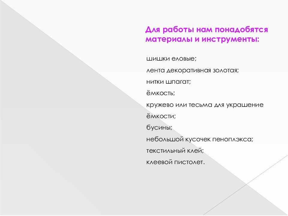 Для работы нам понадобятся материалы и инструменты: шишки еловые; лента декоративная золотая; нитки шпагат; ёмкость; кружево или тесьма для украшение ёмкости; бусины; небольшой кусочек пеноплэкса; текстильный клей; клеевой пистолет.