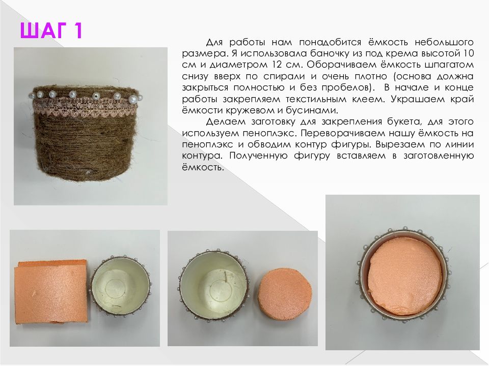 ШАГ 1 Для работы нам понадобится ёмкость небольшого размера. Я использовала баночку из под крема высотой 10 см и диаметром 12 см. Оборачиваем ёмкость шпагатом снизу вверх по спирали и очень плотно (основа должна закрыться полностью и без пробелов). В начале и конце работы закрепляем текстильным клеем. Украшаем край ёмкости кружевом и бусинами. Делаем заготовку для закрепления букета, для этого используем пеноплэкс. Переворачиваем нашу ёмкость на пеноплэкс и обводим контур фигуры. Вырезаем по линии контура. Полученную фигуру вставляем в заготовленную ёмкость.