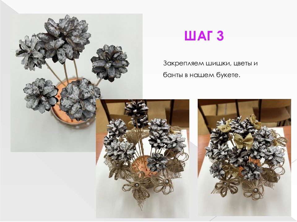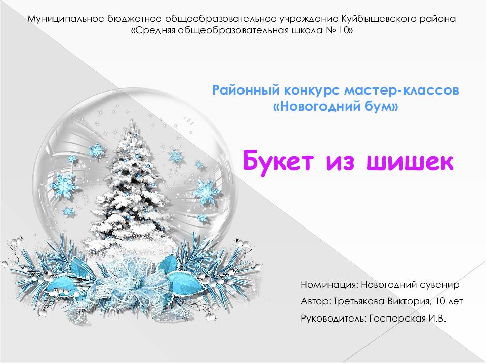Муниципальное бюджетное общеобразовательное учреждение Куйбышевского района «Средняя общеобразовательная школа № 10» Районный конкурс мастер-классов «Новогодний бум» Номинация: Новогодний сувенир Автор : Третьякова Виктория, 10 лет Руководитель: Госперская И.В. Букет из шишек