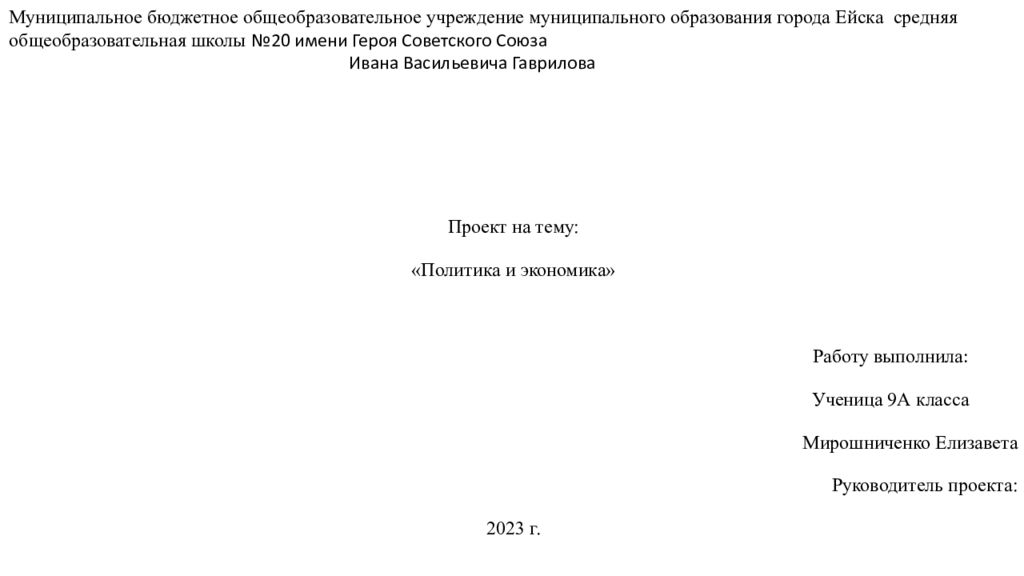 Муниципальное бюджетное общеобразовательное учреждение муниципального образования города Ейс ка средняя общеобразовательная школы №20 имени Героя Советского Союза Ивана Васильевича Гаврилова Проект на тему: «Политика и экономика» Работу выполнила : Ученица 9А класса Мирошниченко Елизавета Руководитель проекта: 2023 г.