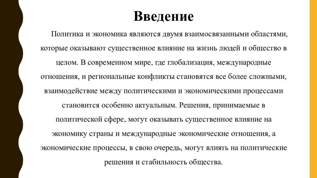 Введение Политика и экономика являются двумя взаимосвязанными областями, которые оказывают существенное влияние на жизнь людей и общество в целом. В современном мире, где глобализация, международные отношения, и региональные конфликты становятся все более сложными, взаимодействие между политическими и экономическими процессами становится особенно актуальным. Решения, принимаемые в политической сфере, могут оказывать существенное влияние на экономику страны и международные экономические отношения, а экономические процессы, в свою очередь, могут влиять на политические решения и стабильность общества.