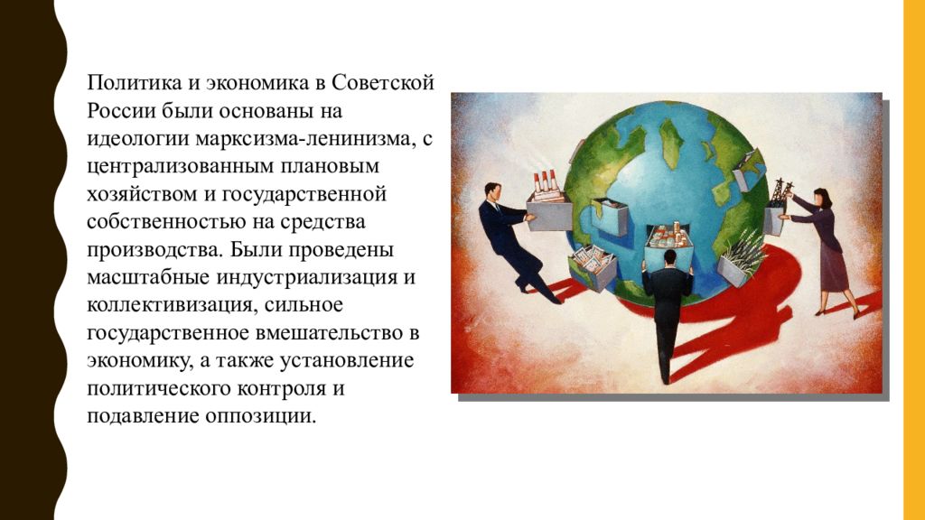 Политика и экономика в Советской России были основаны на идеологии марксизма-ленинизма, с централизованным плановым хозяйством и государственной собственностью на средства производства. Были проведены масштабные индустриализация и коллективизация, сильное государственное вмешательство в экономику, а также установление политического контроля и подавление оппозиции.