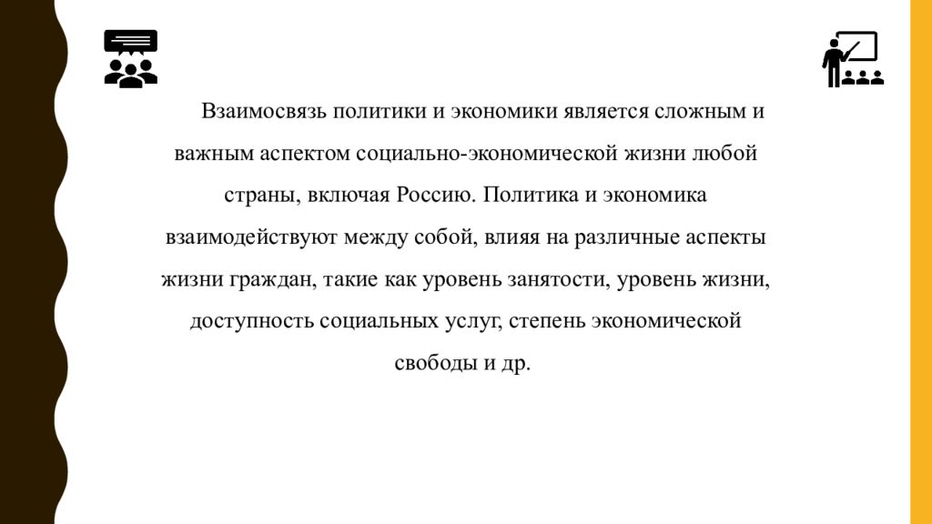 Взаимосвязь политики и экономики является сложным и важным аспектом социально-экономической жизни любой страны, включая Россию. Политика и экономика взаимодействуют между собой, влияя на различные аспекты жизни граждан, такие как уровень занятости, уровень жизни, доступность социальных услуг, степень экономической свободы и др.