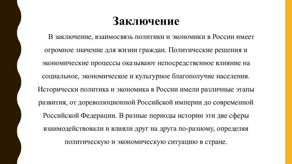 Заключение В заключение, взаимосвязь политики и экономики в России имеет огромное значение для жизни граждан. Политические решения и экономические процессы оказывают непосредственное влияние на социальное, экономическое и культурное благополучие населения. Исторически политика и экономика в России имели различные этапы развития, от дореволюционной Российской империи до современной Российской Федерации. В разные периоды истории эти две сферы взаимодействовали и влияли друг на друга по-разному, определяя политическую и экономическую ситуацию в стране.