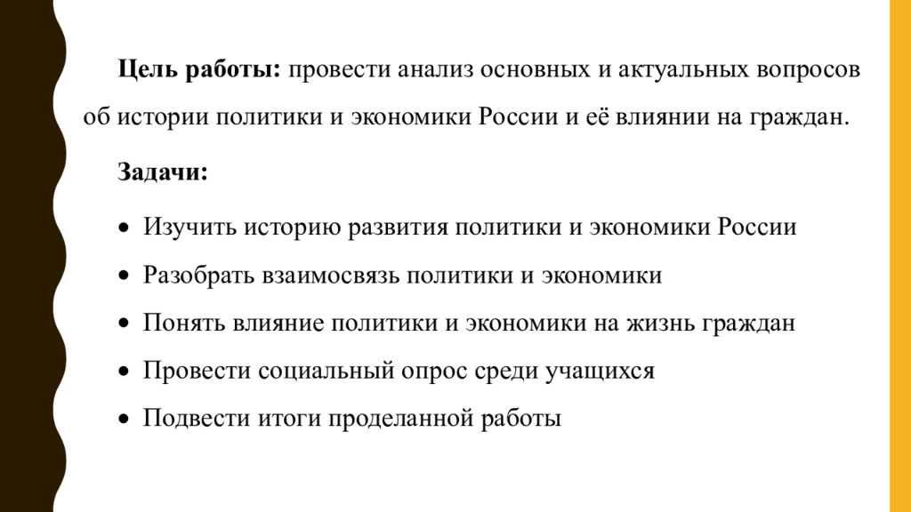 Цель работы: провести анализ основных и актуальных вопросов об истории политики и экономики России и её влиянии на граждан. Задачи: Изучить историю развития политики и экономики России Разобрать взаимосвязь политики и экономики Понять влияние политики и экономики на жизнь граждан Провести социальный опрос среди учащихся Подвести итоги проделанной работы