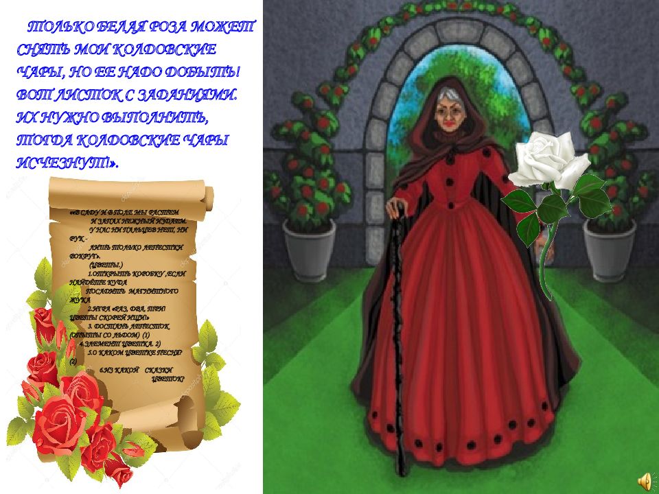 ТОЛЬКО БЕЛАЯ РОЗА МОЖЕТ СНЯТЬ МОИ КОЛДОВСКИЕ ЧАРЫ, НО ЕЕ НАДО ДОБЫТЬ! ВОТ ЛИСТОК С ЗАДАНИЯМИ. ИХ НУЖНО ВЫПОЛНИТЬ, ТОГДА КОЛДОВСКИЕ ЧАРЫ ИСЧЕЗНУТ!». ««В САДУ И В ПОЛЕ МЫ РАСТЕМ И ЗАПАХ НЕЖНЫЙ ИЗДАЕМ. У НАС НИ ПАЛЬЦЕВ НЕТ, НИ РУК - ЛИШЬ ТОЛЬКО ЛЕПЕСТКИ ВОКРУГ». (ЦВЕТЫ.) 1.ОТКРЫТЬ КОРОБКУ,ЕСЛИ НАЙДЁТЕ КУДА ПОСАДИТЬ МАГНИТНОГО ЖУКА 2.ИГРА «РАЗ, ДВА, ТРИ! ЦВЕТЫ СКОРЕЙ ИЩИ!» 3. ДОСТАНЬ ЛЕПЕСТОК (ОПЫТЫ СО ЛЬДОМ) (1) 4.ЭЛЕМЕНТ ЦВЕТКА. 2) 5.О КАКОМ ЦВЕТКЕ ПЕСНЯ? (2) 6.ИЗ КАКОЙ СКАЗКИ ЦВЕТОК ?
