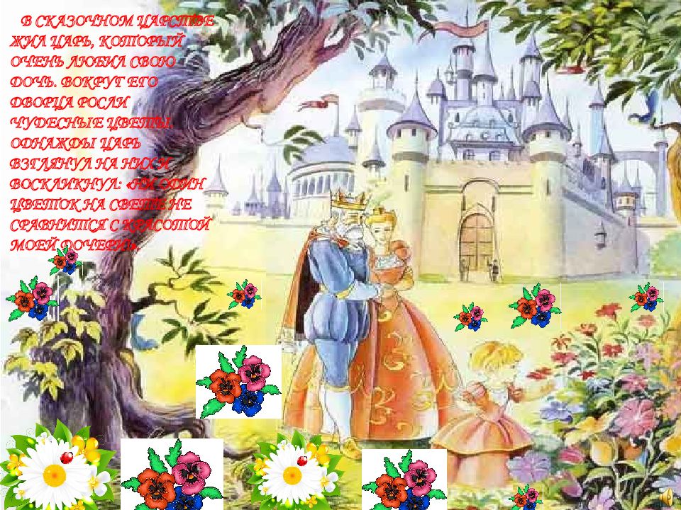 В СКАЗОЧНОМ ЦАРСТВЕ ЖИЛ ЦАРЬ, КОТОРЫЙ ОЧЕНЬ ЛЮБИЛ СВОЮ ДОЧЬ. ВОКРУГ ЕГО ДВОРЦА РОСЛИ ЧУДЕСНЫЕ ЦВЕТЫ. ОДНАЖДЫ ЦАРЬ ВЗГЛЯНУЛ НА НИХ И ВОСКЛИКНУЛ: «НИ ОДИН ЦВЕТОК НА СВЕТЕ НЕ СРАВНИТСЯ С КРАСОТОЙ МОЕЙ ДОЧЕРИ!».