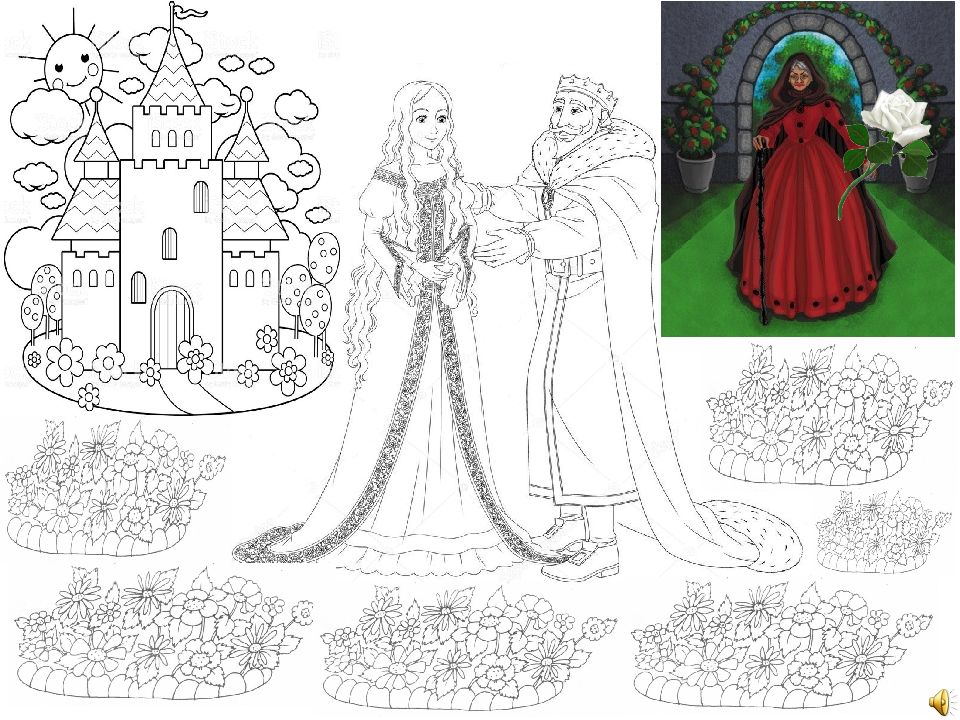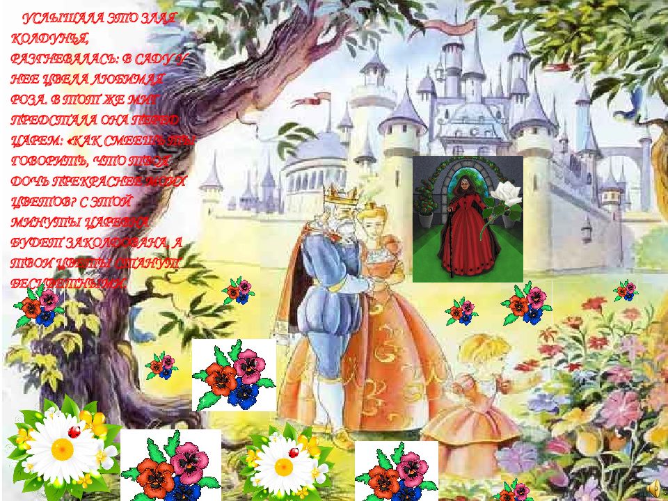УСЛЫШАЛА ЭТО ЗЛАЯ КОЛДУНЬЯ, РАЗГНЕВАЛАСЬ: В САДУ У НЕЕ ЦВЕЛА ЛЮБИМАЯ РОЗА. В ТОТ ЖЕ МИГ ПРЕДСТАЛА ОНА ПЕРЕД ЦАРЕМ: «КАК СМЕЕШЬ ТЫ ГОВОРИТЬ, ЧТО ТВОЯ ДОЧЬ ПРЕКРАСНЕЕ МОИХ ЦВЕТОВ? С ЭТОЙ МИНУТЫ ЦАРЕВНА БУДЕТ ЗАКОЛДОВАНА, А ТВОИ ЦВЕТЫ СТАНУТ БЕСЦВЕТНЫМИ.