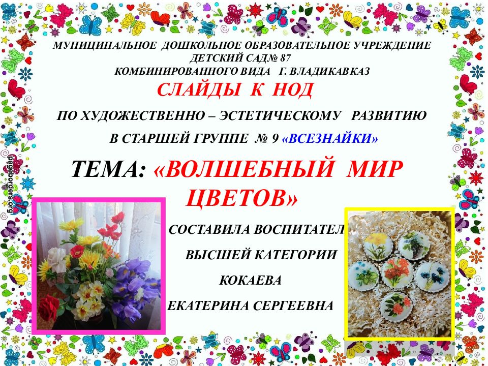 МУНИЦИПАЛЬНОЕ ДОШКОЛЬНОЕ ОБРАЗОВАТЕЛЬНОЕ УЧРЕЖДЕНИЕ ДЕТСКИЙ САД№ 87 КОМБИНИРОВАННОГО ВИДА Г. ВЛАДИКАВКАЗ СЛАЙДЫ К НОД ПО ХУДОЖЕСТВЕННО – ЭСТЕТИЧЕСКОМУ РАЗВИТИЮ В СТАРШЕЙ ГРУППЕ № 9 «ВСЕЗНАЙКИ» ТЕМА : « ВОЛШЕБНЫЙ МИР ЦВЕТОВ » СОСТАВИЛА ВОСПИТАТЕЛЬ ВЫСШЕЙ КАТЕГОРИИ КОКАЕВА ЕКАТЕРИНА СЕРГЕЕВНА