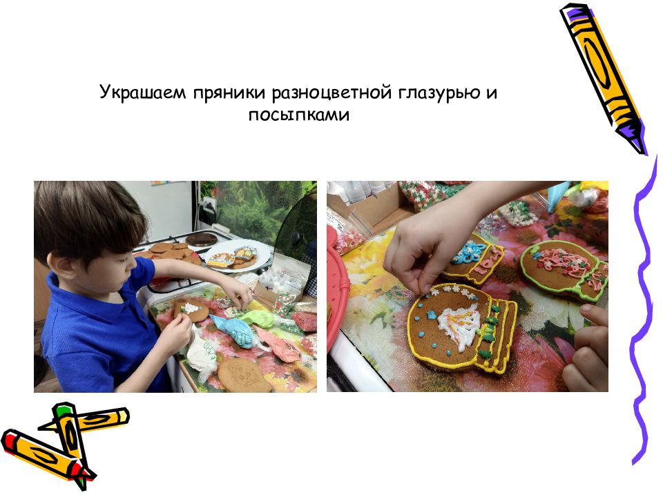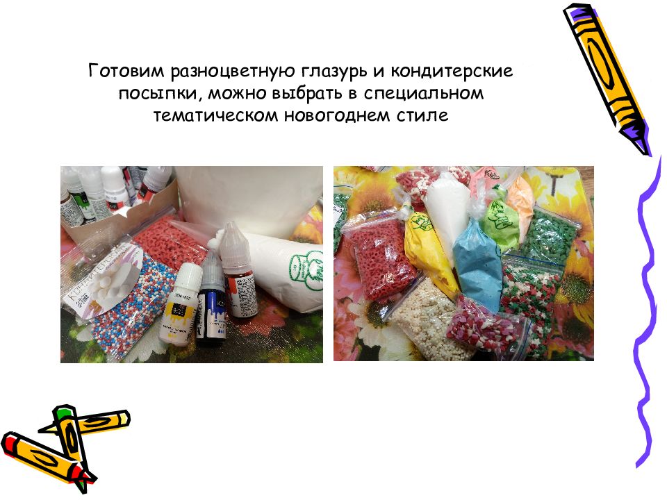 Слайд 6: Готовим разноцветную глазурь и кондитерские посыпки, можно выбрать в специальном тематическом новогоднем стиле