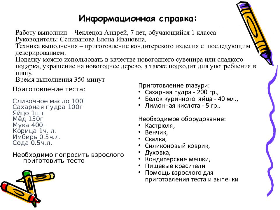 Работу выполнил – Чеклецов Андрей, 7 лет, обучающийся 1 класса Руководитель: Селиванова Елена Ивановна. Техника выполнения – приготовление кондитерского изделия с последующим декорированием. Поделку можно использовать в качестве новогоднего сувенира или сладкого подарка, украшение на новогоднее дерево, а также подходит для употребления в пищу. Время выполнения 350 минут Приготовление теста: Сливочное масло 100г Сахарная пудра 100г Яйцо 1шт Мёд 150г Мука 400г Корица 1ч. л. Имбирь 0.5ч.л. Сода 0.5ч.л. Необходимо попросить взрослого приготовить тесто Приготовление глазури: Сахарная пудра - 200 гр., Белок куринного яйца - 40 мл., Лимонная кислота - 5 гр.. Необходимое оборудование: Кастрюля, Венчик, Скалка, Силиконовый коврик, Духовка, Кондитерские мешки, Пищевые красители Помощь взрослого для приготовления теста и выпечки