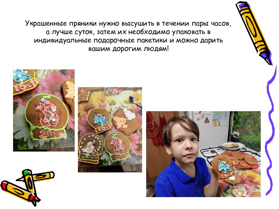 Слайд 8: Украшенные пряники нужно высушить в течении пары часов, а лучше суток, затем их необходимо упаковать в индивидуальные подарочные пакетики и можно дарить вашим дорогим людям!