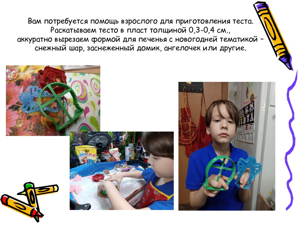 Слайд 3: Вам потребуется помощь взрослого для приготовления теста. Раскатываем тесто в пласт толщиной 0,3-0,4 см., аккуратно вырезаем формой для печенья с новогодней тематикой – снежный шар, заснеженный домик, ангелочек или другие