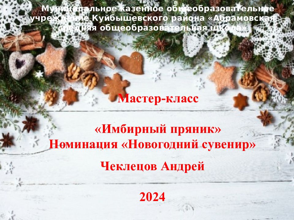 Муниципальное казенное общеобразовательное учреждение Куйбышевского района «Абрамовская средняя общеобразовательная школа» Мастер-класс «Имбирный пряник» Номинация «Новогодний сувенир» Чеклецов Андрей 2024