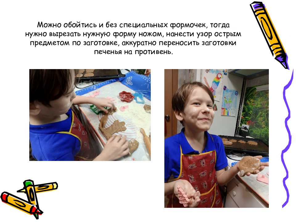 Слайд 4: Можно обойтись и без специальных формочек, тогда нужно вырезать нужную форму ножом, нанести узор острым предметом по заготовке, аккуратно переносить заготовки печенья на противень
