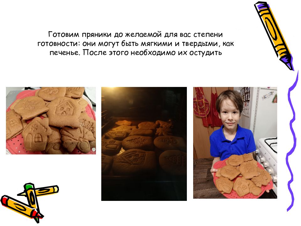 Слайд 5: Готовим пряники до желаемой для вас степени готовности: они могут быть мягкими и твердыми, как печенье. После этого необходимо их остудить