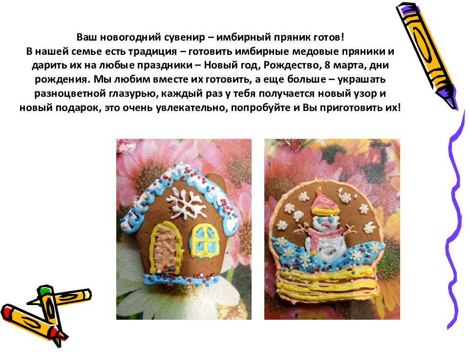 Ваш новогодний сувенир – имбирный пряник готов! В нашей семье есть традиция – готовить имбирные медовые пряники и дарить их на любые праздники – Новый год, Рождество, 8 марта, дни рождения. Мы любим вместе их готовить, а еще больше – украшать разноцветной глазурью, каждый раз у тебя получается новый узор и новый подарок, это очень увлекательно, попробуйте и Вы приготовить их!